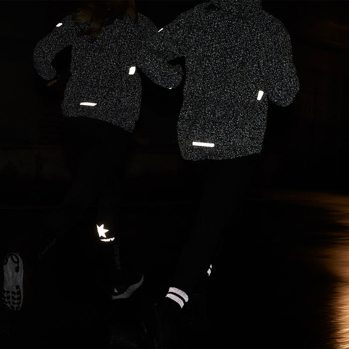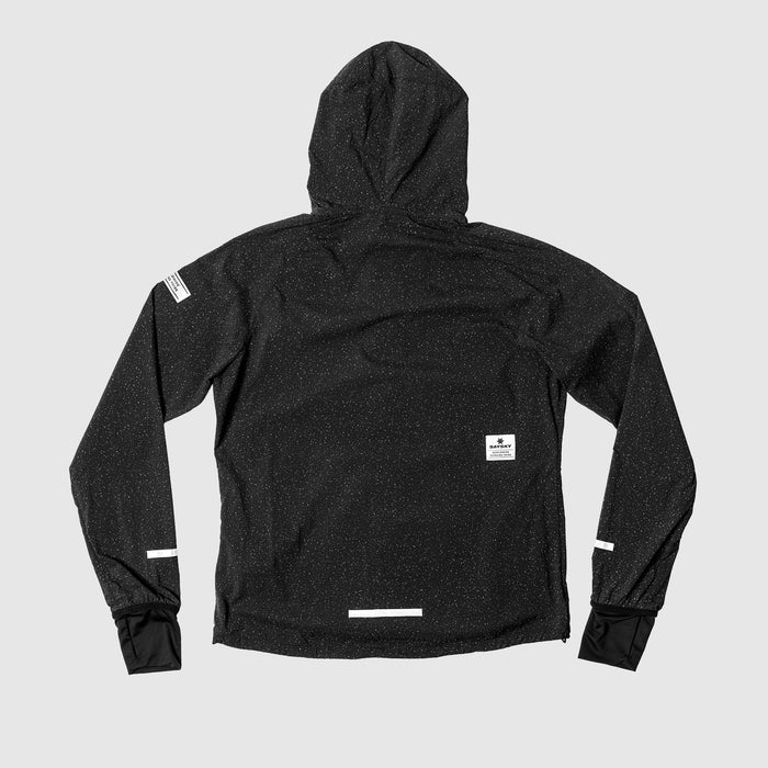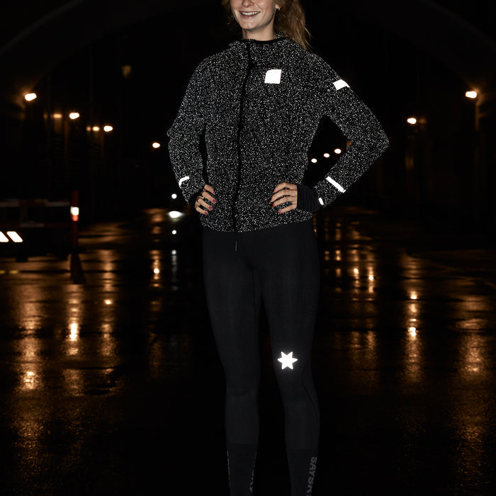 La chaqueta SAYSKY Universe Luxe es una chaqueta para correr para mujer en negro, hecha para soportar el viento. Viene con un diseño de universo reflectante para garantizar una alta visibilidad en la oscuridad. Tiene etiquetas reflectantes SAYSKY en el pecho y tiras reflectantes en las mangas y la espalda. El tejido es súper suave y ligero para garantizar un ajuste cómodo y una alta transpirabilidad. El panel trasero está terminado con agujeros cortados con láser para una mayor transpirabilidad.
