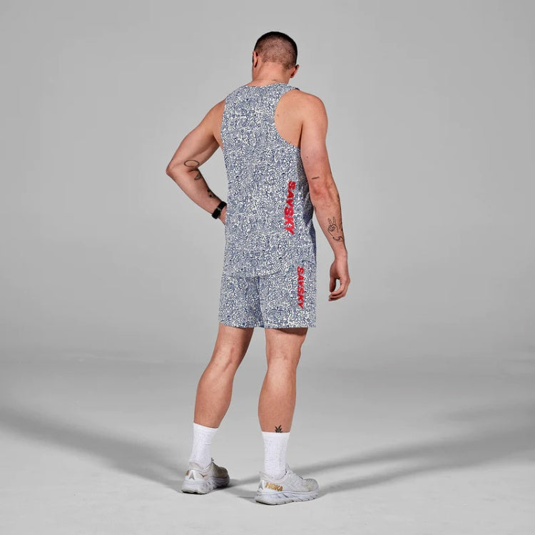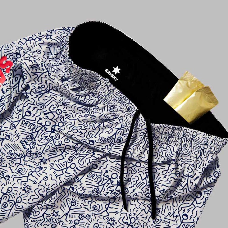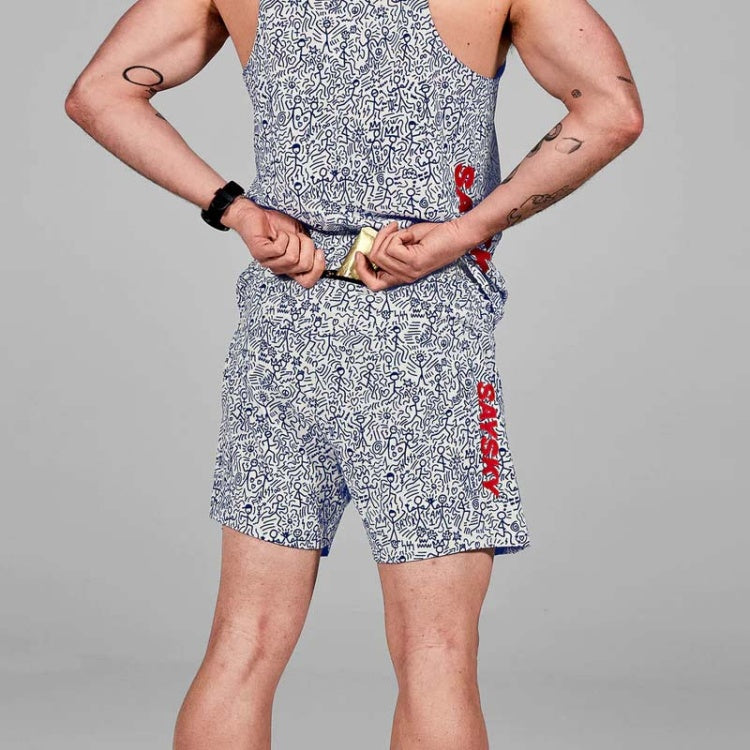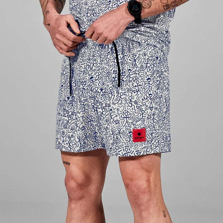 Estos shorts SAYSKY Pace 5'' son un clásico de shorts para correr, pero mucho mejores. Este es uno de los superventas de todos los tiempos y por buenas razones. Son increíblemente ligeros y transpirables, con un ajuste regular diseñado para un alto rendimiento. Esta versión Contemporary Cartoon es de color blanco con un estampado de animación de figuras de palitos dibujadas a mano en azul oscuro, un logo de SAYSKY en el lateral y una etiqueta tejida en blanco en la parte delantera.