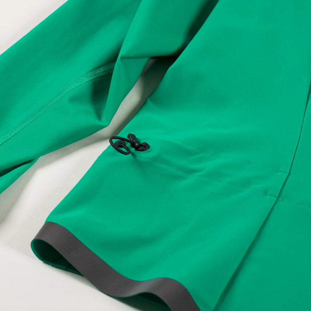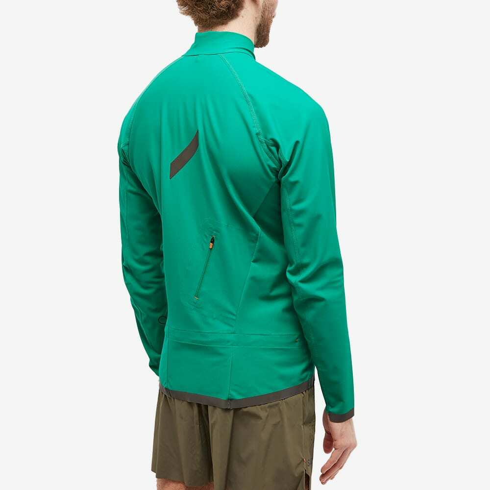 La ubicación estratégica de paneles en el cuerpo evita que esta parte superior ajustada se suba o se arrugue al coincidir con la forma de tu torso inferior. Luego, cortamos con láser los puños y el dobladillo y diseñamos una construcción ergonómica del brazo para asegurar que las mangas queden exactamente donde las deseas mientras corres. En la parte trasera, hay un sistema de cordón en la parte baja de la espalda para mantener alejado el viento.