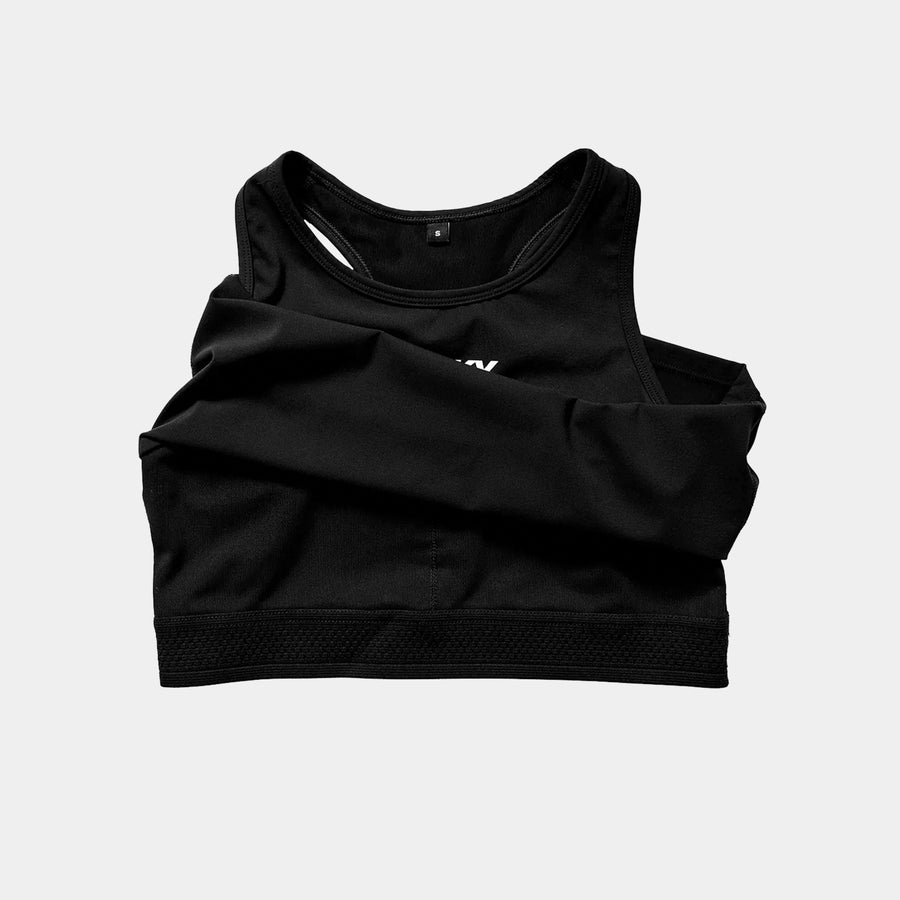 Capa exterior: Crop top hecho con tejido SAYSKYDRY Performance Fabric, suave, liviano y con capacidad técnica para absorber la humedad y mantenerte seca y cómoda mientras corres