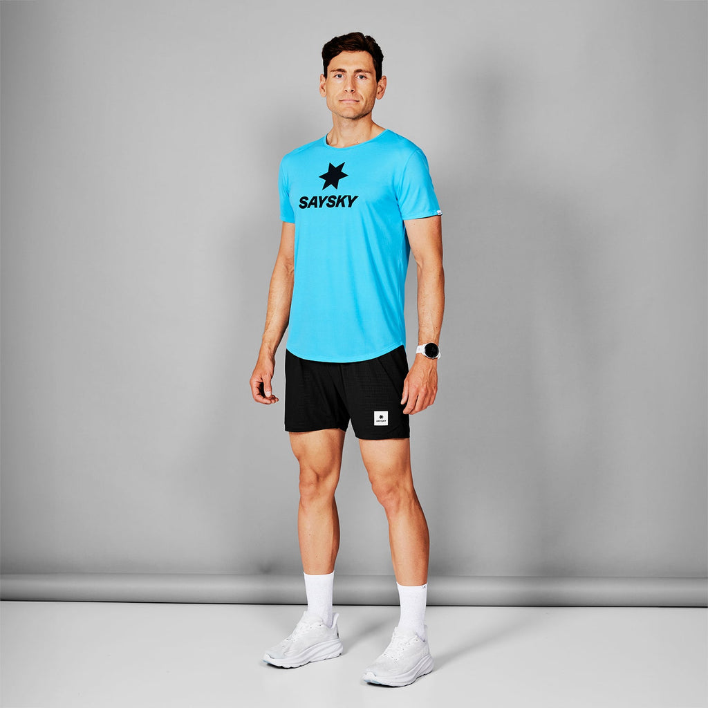 Camiseta técnica de gama alta, ideal para corredores que buscan lo mejor. Corte “race fit”, diseño sencillo en azul claro con logo SAYSKY en el pecho y etiqueta tejida en la espalda. Fabricada con 79 % de poliéster reciclado, ofrece ligereza, tacto suave, gran flexibilidad y no se adhiere al cuerpo.