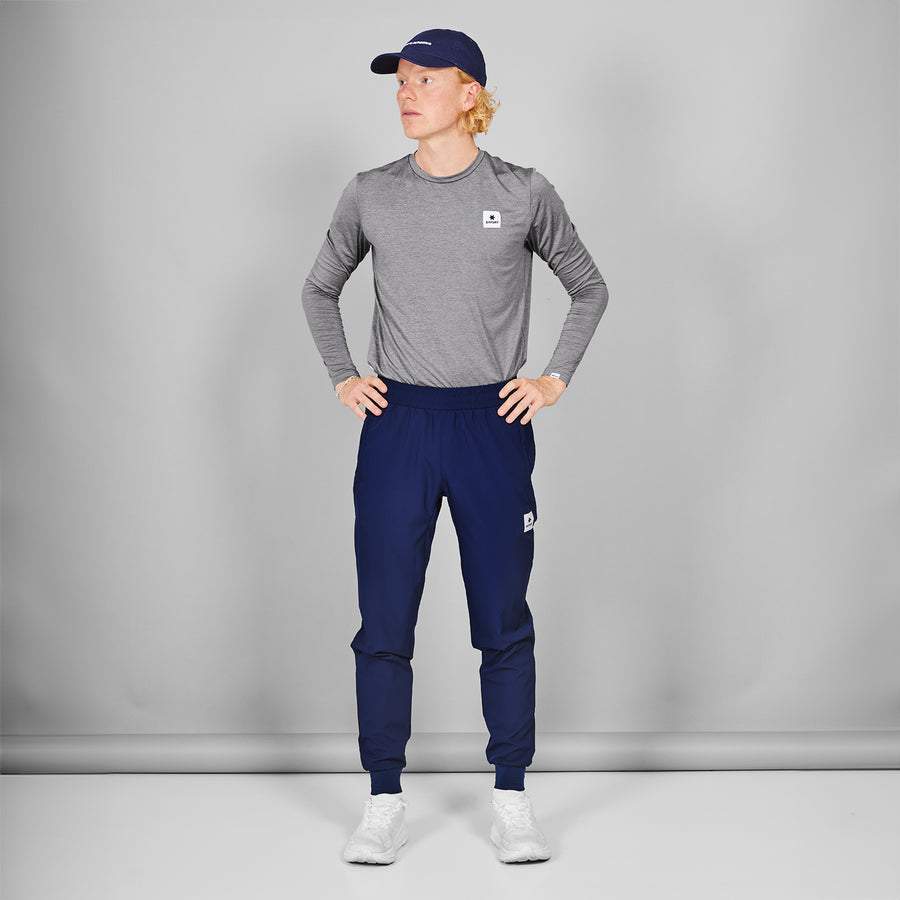 Los pantalones de ritmo SAYSKY son los favoritos de todos los tiempos. Es un par de pantalones de running casuales, diseñados para ir rápido en la carrera y verse genial sobre la marcha. Es un pantalón unisex con un ajuste estrecho desde las rodillas y hasta los puños de los tobillos. Vienen en azul marino con una etiqueta SAYSKY tejida reflectante en blanco y una pequeña impresión reflectante en la pantorrilla izquierda.